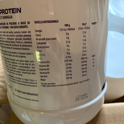 意大利🇮🇹why植物蛋白+维生素B12,香草口味,100%纯植物蛋白,特别添加螺旋藻 和 维生素B组,含有B1,B2,B6和B12。不含蔗糖,它们富含维生素和植物提取物,特别是:-维生素B6有助于蛋白质和糖原的生理代谢,-硫胺素可促进正常的能量代谢,-氰钴胺素和核黄素可减少疲劳和疲劳,-maqui以其独特的功效而闻名。抗氧化作用,而螺旋藻具有辅助和恢复作用。使用方法:每天一次将30克产品(2勺)溶解在250-300毫升水或其他液体中。