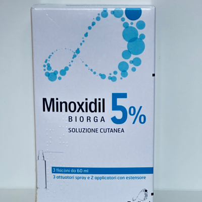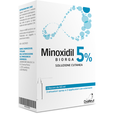 Minoxidil Biorga 5%,皮肤溶液特别适用于头部上部脱发或头发变弱的男性和头发普遍变弱的女性。