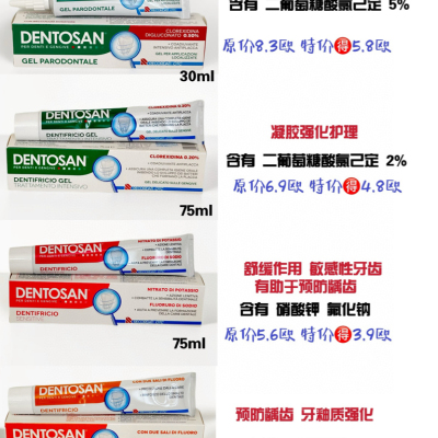 意大利🇮🇹DENTOSAN牙膏凝胶强化护理牙膏含有 0.50% 氯己定的牙膏。它是牙龈上的一种精致凝胶,是一种抗牙菌斑佐剂,可通过抑制形成牙菌斑的细菌的生长来确保完整的口腔卫生。牙菌斑由数以百万计的细菌组成,这些细菌会导致食物残渣发酵,从而产生侵蚀牙釉质并导致蛀牙的酸。