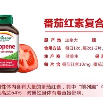 番茄红素属于类胡萝卜素,一组在自然界中非常常见的黄紫色色素。它们存在于西红柿、粉红葡萄柚、杏子、胡萝卜和西瓜中。对番茄红素的兴趣在于其强大的抗氧化活性,植物利用它来中和自由基。Jamieson番茄红素是从西红柿中提取的,具有前列腺功能和强大的抗氧化特性,可用于对抗衰老、降低心血管疾病的风险和抵消自由基的作用。每片 Jamieson 番茄红素片含有 10 毫克番茄红素和 100 毫克浓缩成熟番茄果肉。