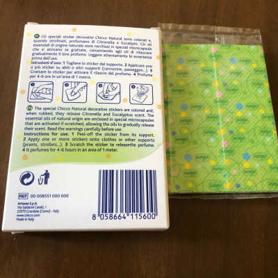 chicco 自然多彩的防蚊贴,12 件式包装。香味和五颜六色的蚊子贴纸与柠檬草和白杨树。